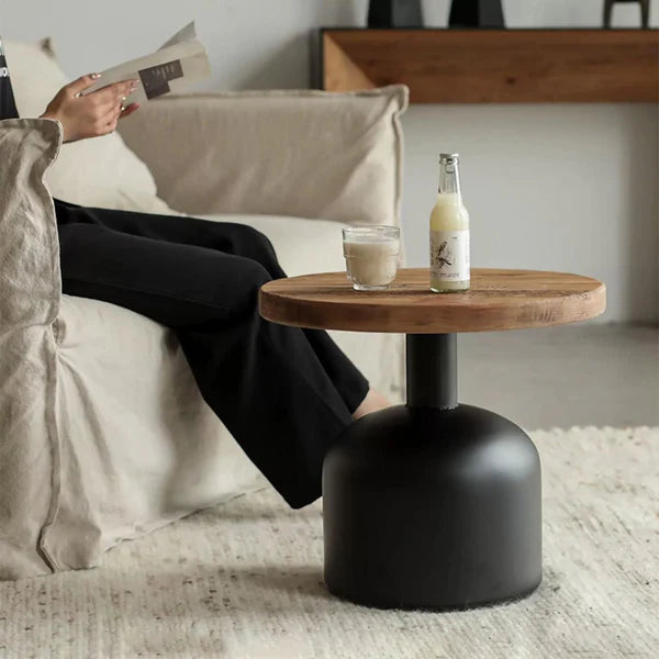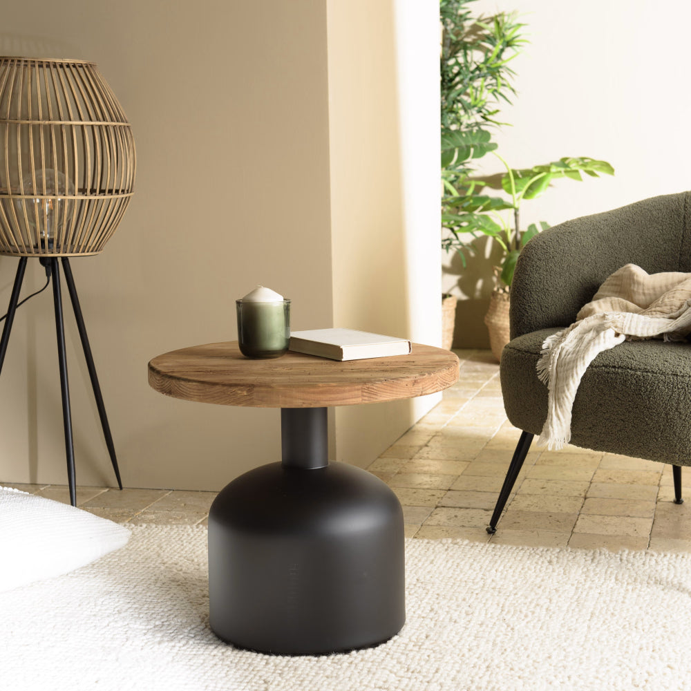 Απάντηση: Το τραπεζάκι είναι κατασκευασμένο από ανακυκλωμένο ξύλο πεύκου, προσφέροντας φυσική αισθητική και οικολογικό χαρακτήρα.