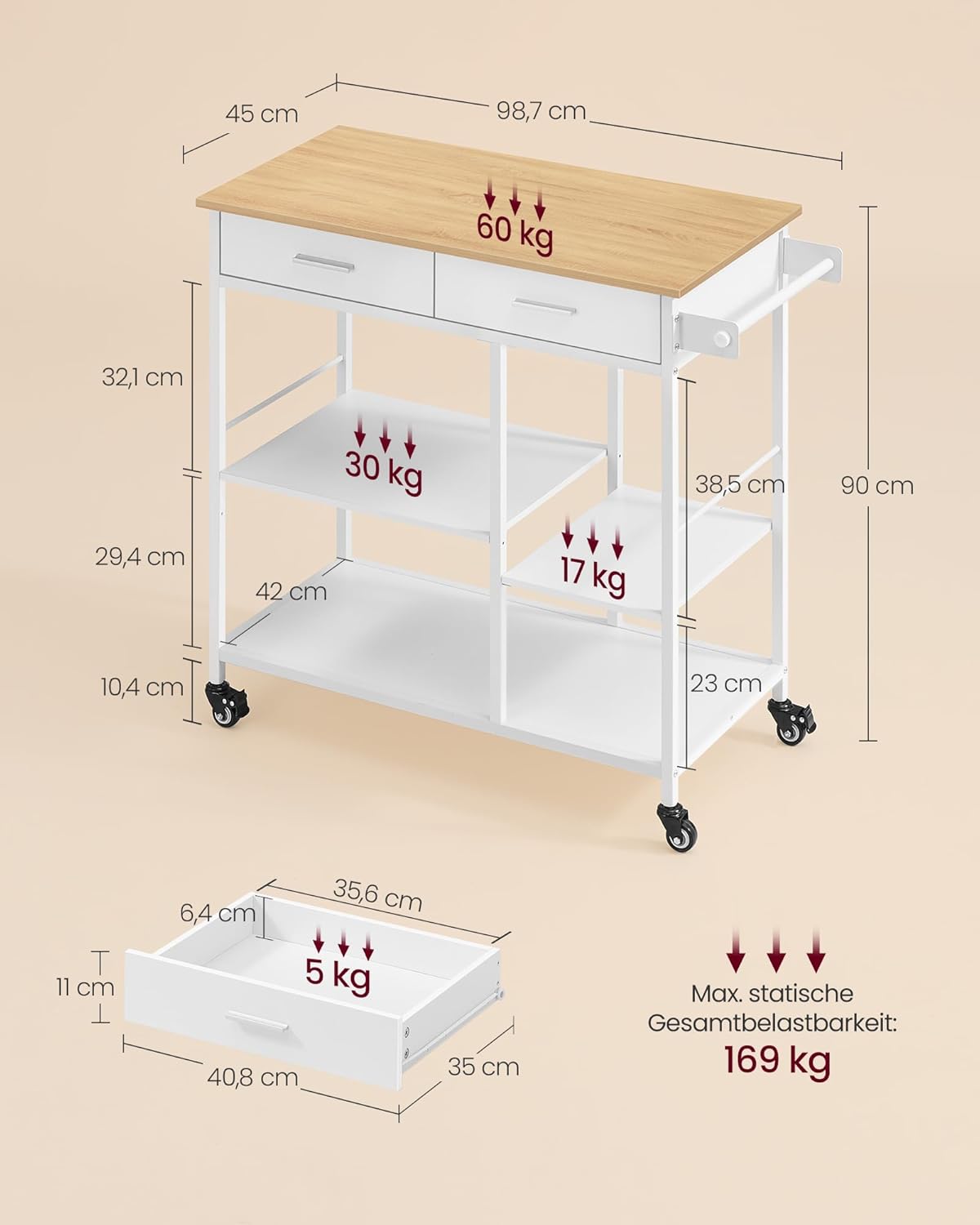 ΙΔΑΝΙΚΟ ΓΙΑ ΜΙΚΡΟΥΣ ΧΩΡΟΥΣ. Με διαστάσεις 45 x 98,7 x 90 cm, αυτό το καρότσι κουζίνας είναι η ιδανική λύση για να αξιοποιήσετε στο έπακρο τον αποθηκευτικό χώρο και την επιφάνεια εργασίας σε μικρές κουζίνες, τραπεζαρίες ή σαλόνια.
