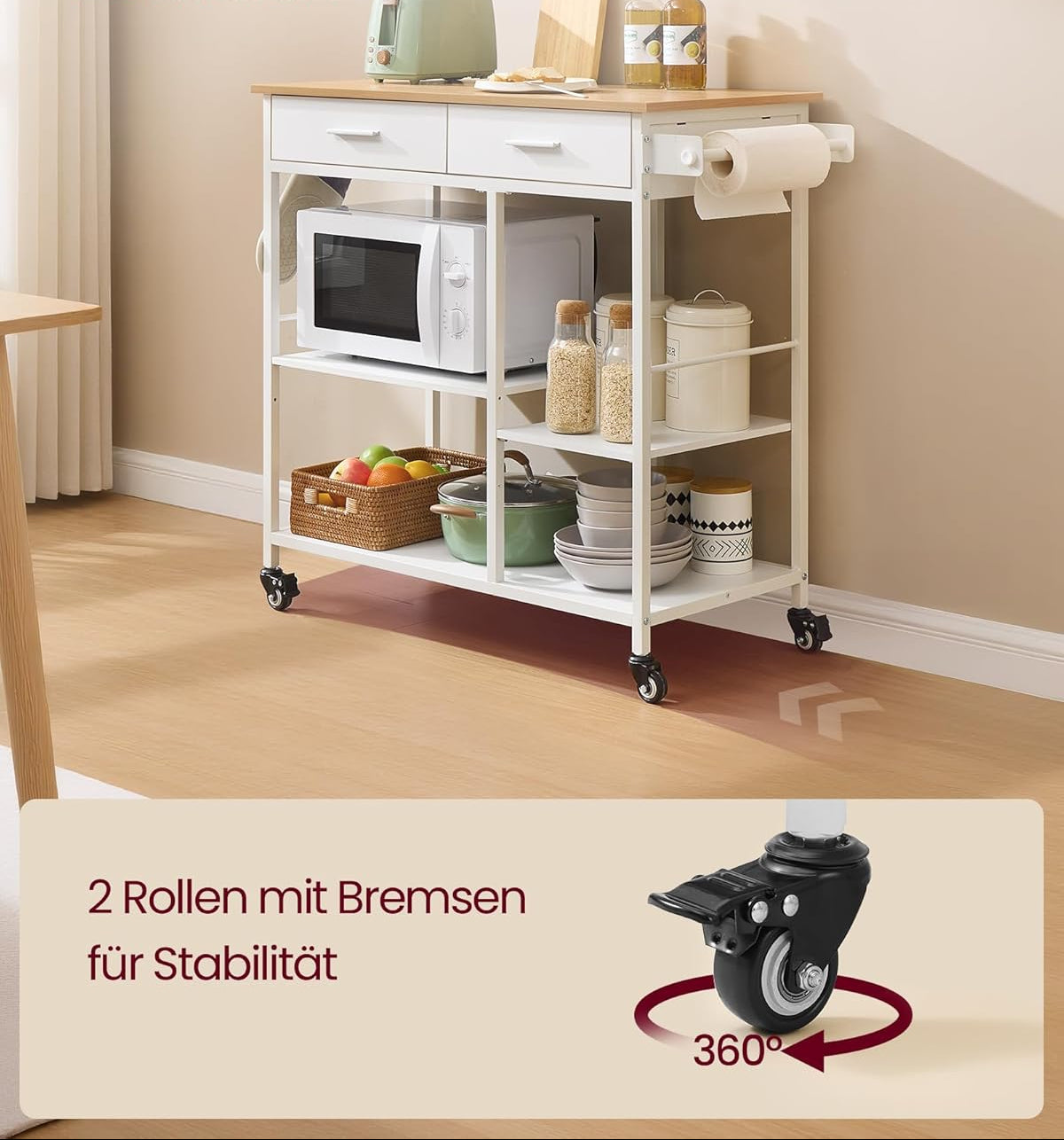 ΕΥΚΟΛΟ ΣΤΗ ΜΕΤΑΚΙΝΗΣΗ ΚΑΙ ΤΟ ΚΛΕΙΔΩΜΑ Με 4 περιστρεφόμενες ρόδες 360°, 2 από αυτές με φρένα, μπορείτε να μετακινήσετε αυτό το κινητό νησί της κουζίνας οπουδήποτε ή να το στερεώσετε σε ένα σημείο.