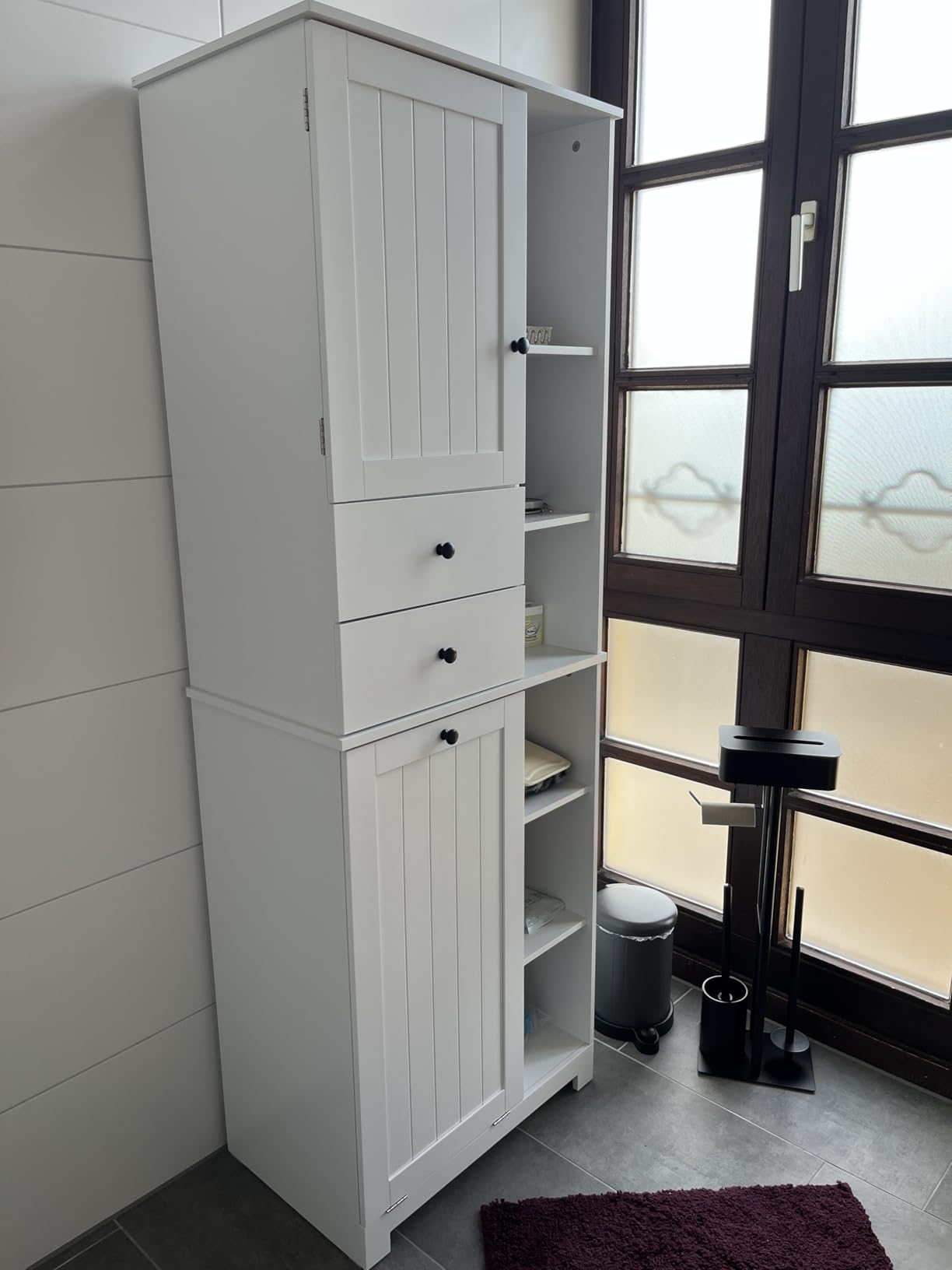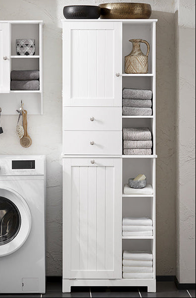 Αυτό το ψηλό ντουλάπι με πόρτα και συρτάρι είναι ιδιαίτερα κατάλληλο για την αποθήκευση λιγότερο ελκυστικών αξεσουάρ μπάνιου, όπως είδη καθαρισμού ή χαρτί υγείας. Με τα ψηλά ντουλάπια μπάνιου με έξι ανοιχτά ράφια, έχετε τα σκεύη του μπάνιου σας άμεσα ορατά και εύκολα προσβάσιμα.