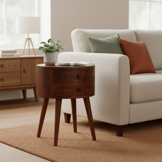 Στρογγυλό Κομοδίνο Τραπεζάκι Υπνοδωματίου Βοηθητικό με 2 Συρτάρια Μασίφ Ξύλο Φινίρισμα Καστανιά IN907