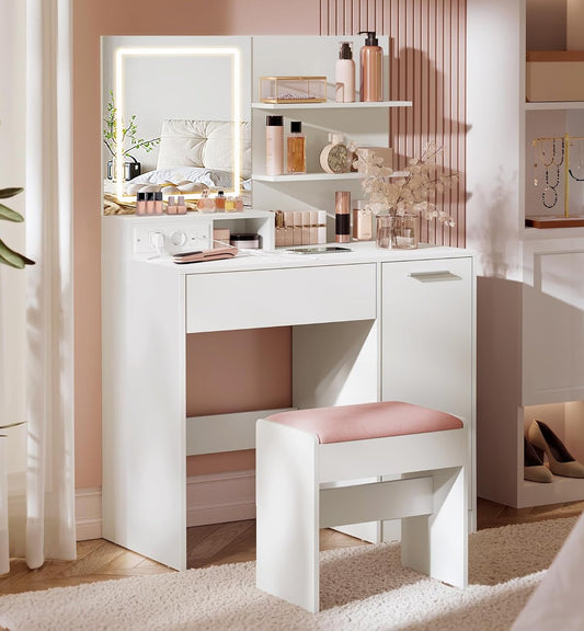 Τραπέζι Μπουντουάρ Μακιγιάζ Tουαλέτας Με Σκαμπό Κρεβατοκάμαρας Καθρέφτης Με Ντουλάπι Λευκό με Φωτισμό LED Ρυθμιζόμενη Φωτεινότητα RD-T125W01
