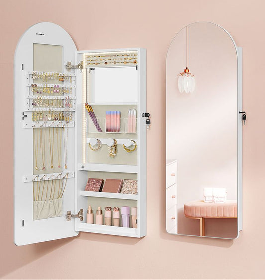 Επιτοίχιος Καθρέφτης 140 εκ Ύψος Κρεμαστό Ντουλάπι Κοσμημάτων Ντουλάπι με Εσωτερικό Καθρέφτη και LED Φωτισμό JJ-C032W01