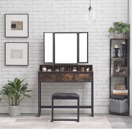 Τραπέζι Μπουντουάρ Μακιγιάζ Τραπέζι Μεικαπ Τουαλέτας Κρεβατοκάμαρας με Σκαμπό Καθρέφτης Vintage Καφέ RV-T004B01