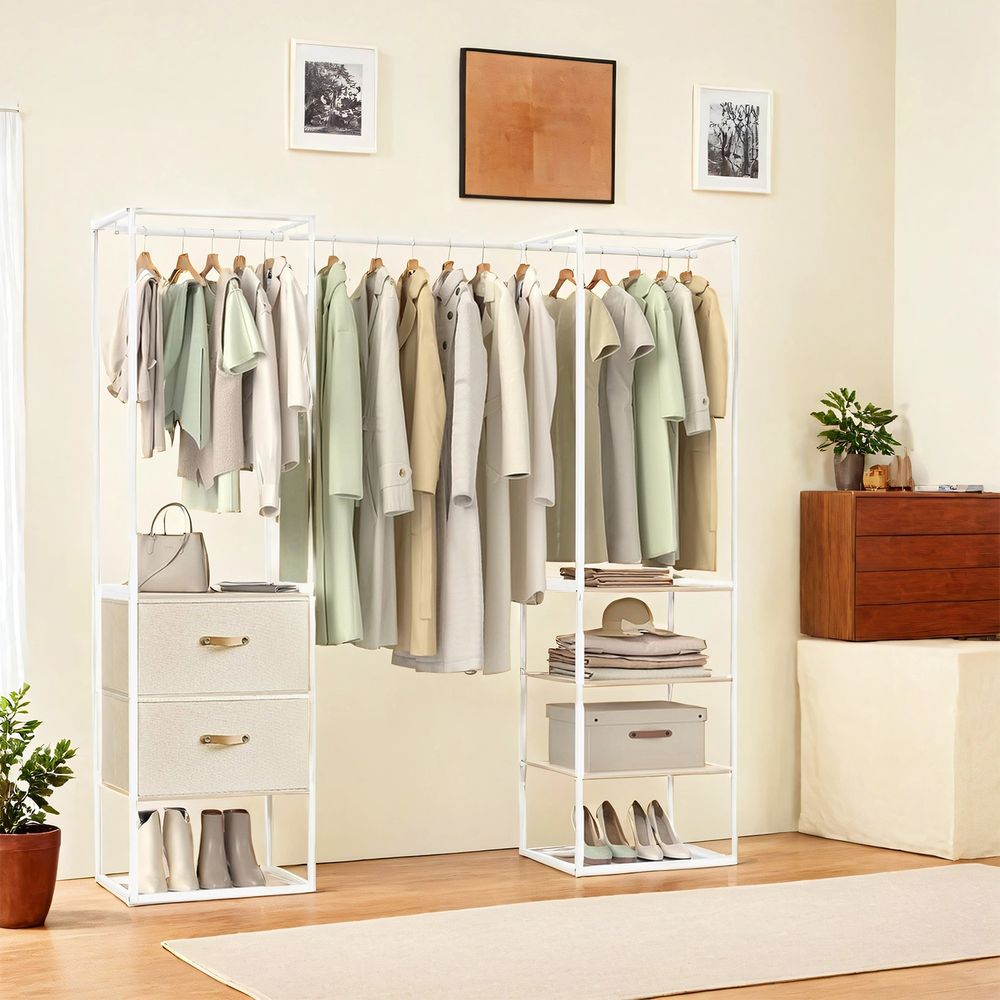 Με 2 σταθερές ράγες ρούχων, 1 επεκτεινόμενη ράγα ρούχων, 2 υφασμάτινα συρτάρια και 4 ράφια, η φορητή ντουλάπα είναι κατάλληλη για πουκάμισα, μπουφάν, παντελόνια, παπούτσια, τσάντες, βαλίτσες και άλλα αξεσουάρ.