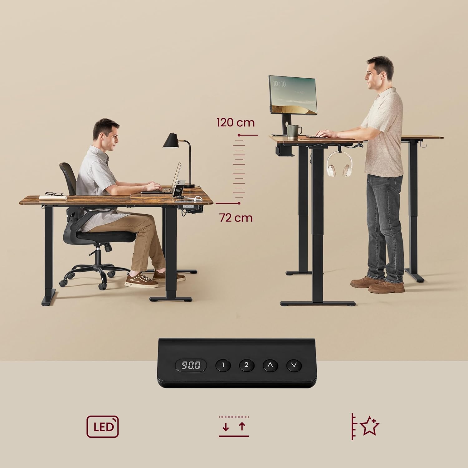 - Εργαστείτε άνετα, παραμείνετε υγιείς: Το γραφείο είναι ρυθμιζόμενο σε ύψος μεταξύ 72-120 cm, επιτρέποντάς σας να εναλλάσσεστε μεταξύ καθιστικής και ορθοστασίας και μειώνοντας έτσι την κόπωση από την παρατεταμένη καθιστή θέση. Η λειτουργία μνήμης με 2 ρυθμίσεις ύψους διευκολύνει τις γρήγορες ρυθμίσεις.