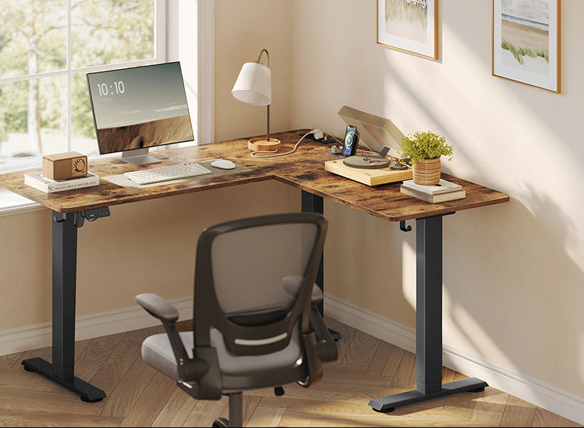 - Σχεδιασμός σε σχήμα L: Το γραφείο σε σχήμα L με ρυθμιζόμενο ύψος ταιριάζει απόλυτα στις γωνίες, κάτι που όχι μόνο αξιοποιεί στο έπακρο τον χώρο αλλά δημιουργεί και έναν ευρύχωρο χώρο εργασίας – ιδανικό για γραφείο ή γραφείο.