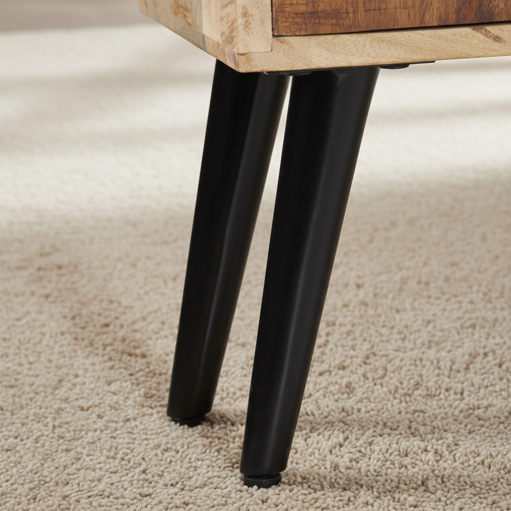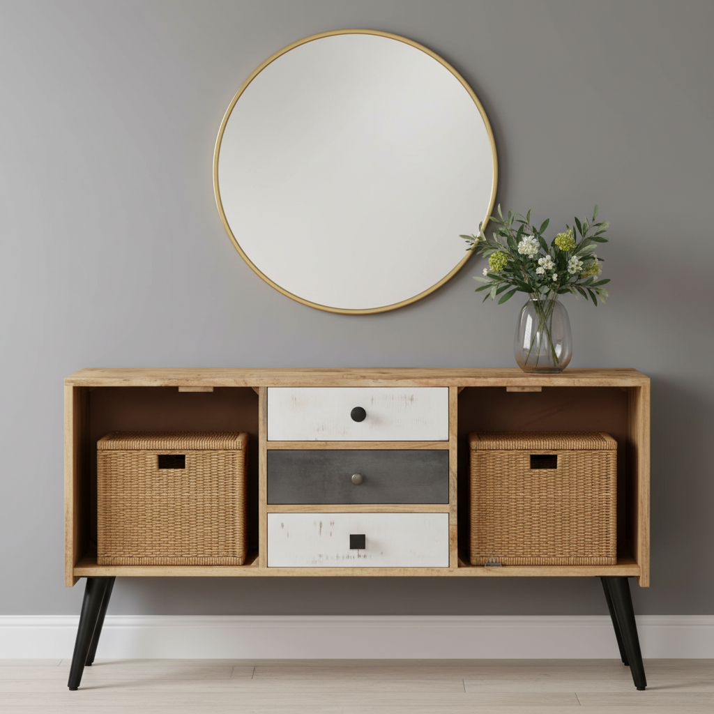 Εισάγετε την κομψότητα του στυλ του μέσου αιώνα στον χώρο σας με αυτό το εξαιρετικό μπουφέ, κατασκευασμένο από μασίφ ξύλο μάνγκο. Αυτό το κομμάτι διαθέτει γυαλιστερό φινίρισμα που αποπνέει μια ατμόσφαιρα φινέτσας. Το ξύλο μάνγκο διακρίνεται για την πυκνή ανθεκτικότητά του και την εκπληκτική του επιφάνεια με καφέ και χρυσές ρίγες που ενισχύουν τη φυσική του ομορφιά.