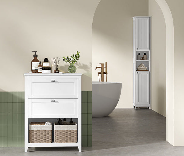 - [Απλό και κομψό] Καθαρές γραμμές, πόμολα σε σχήμα διαμαντιού, καλάθια από συνθετικό ρατάν, φαρδιά πόδια... Τα αρμονικά στοιχεία αυτής της συρταριέρας δίνουν στο μπάνιο σας μια φρέσκια και φυσική πινελιά.