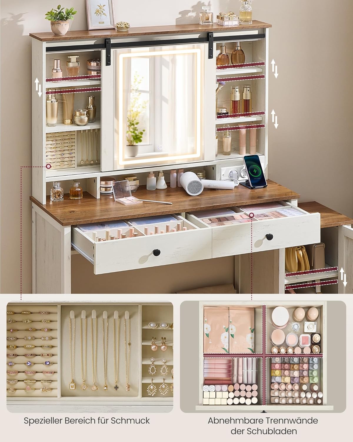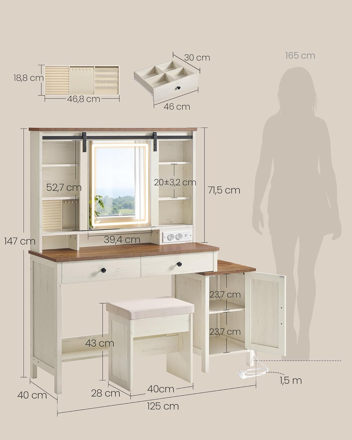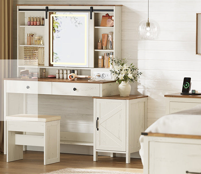 Τραπέζι Μπουντουάρ Μακιγιάζ Tουαλέτας Με Σκαμπό Κρεβατοκάμαρας Καθρέφτης Αφής Ντουλάπι Κοσμημάτων και Πρίζες Παλαιωμένο Λευκό RD-T136W01