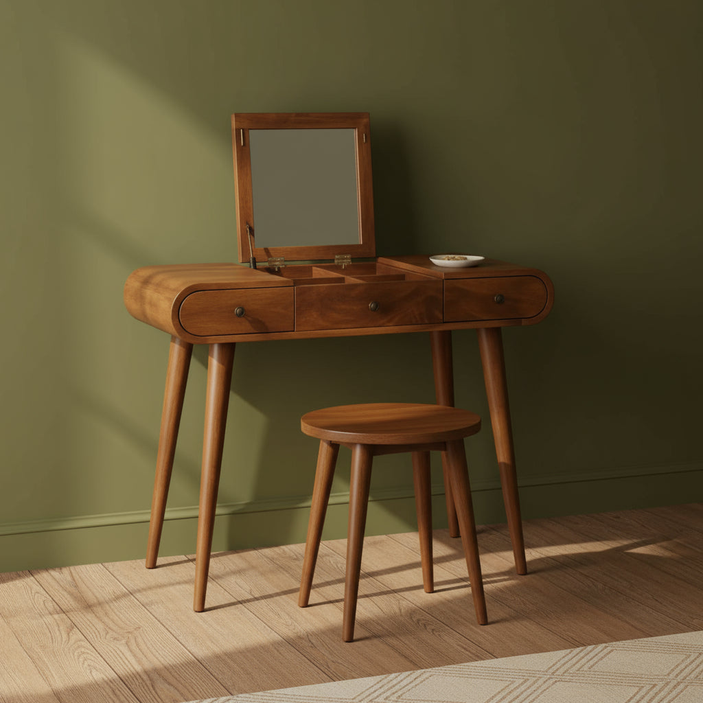 Ανακαλύψτε τον συνδυασμό κλασικής κομψότητας και μοντέρνας λειτουργικότητας με την χειροποίητη μπουντουάρ μας, σχολαστικά κατασκευασμένη από 100% μασίφ ξύλο μάνγκο. Αυτό το εξαιρετικό κομμάτι διαθέτει απαλές στρογγυλεμένες άκρες και πόδια σκανδιναβικού στιλ, που ακτινοβολούν κομψότητα και σταθερότητα. Ο μοναδικός πτυσσόμενος καθρέφτης προσθέτει ευελιξία, μετατρέποντας αυτήν την μπουντουάρ σε μια πολυλειτουργική κονσόλα.